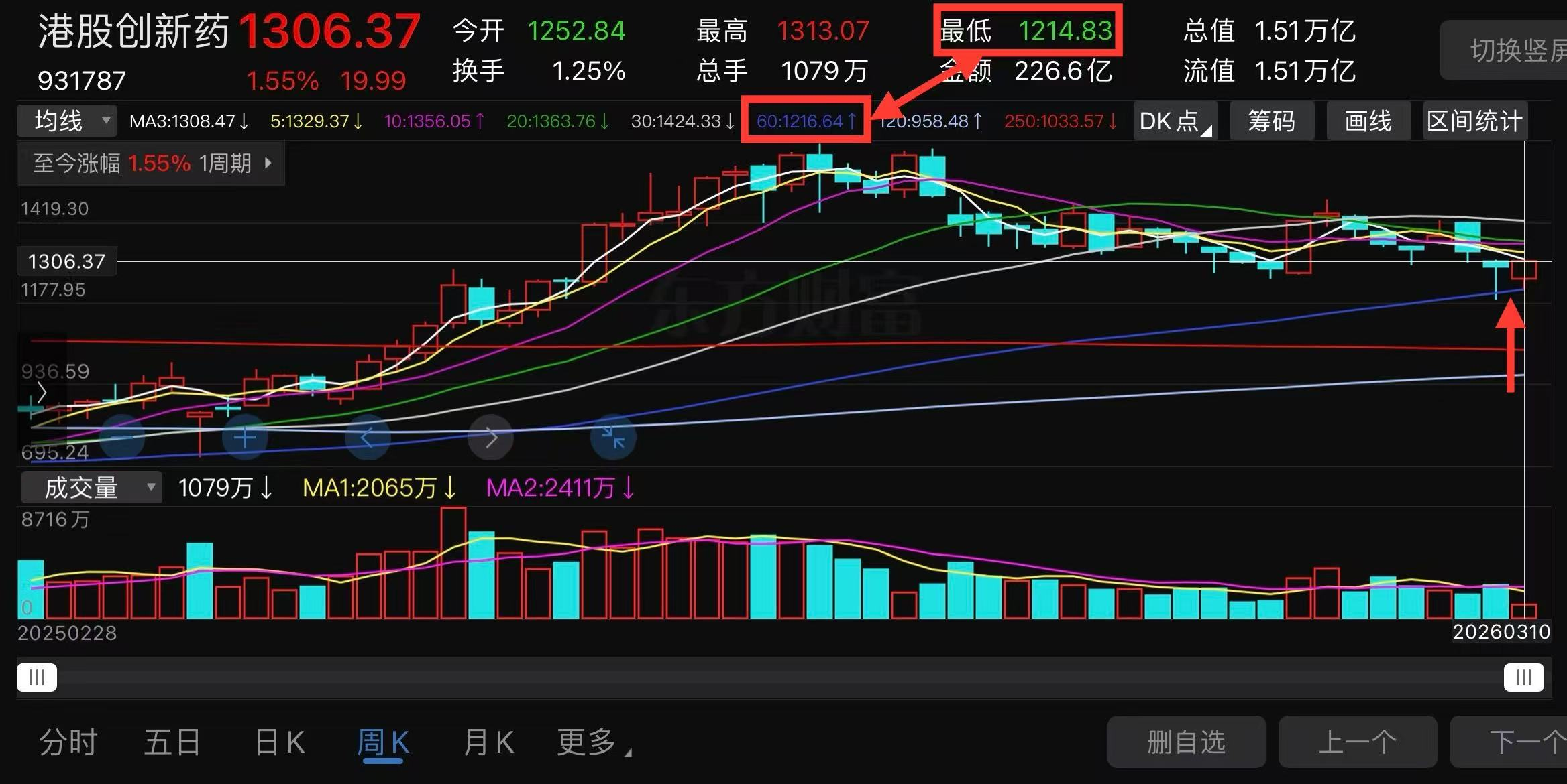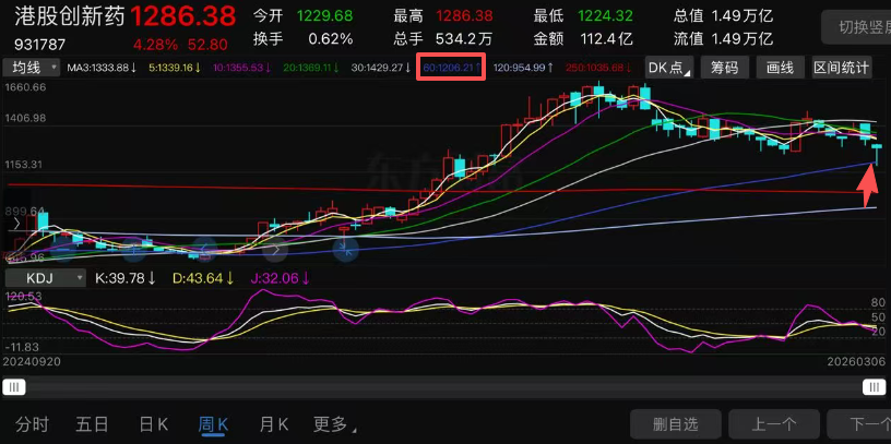 没错,还要看周线,港股创新药60周线1206附近(如果是2月底看,60周线价格1196,距离1188就非常接近。)