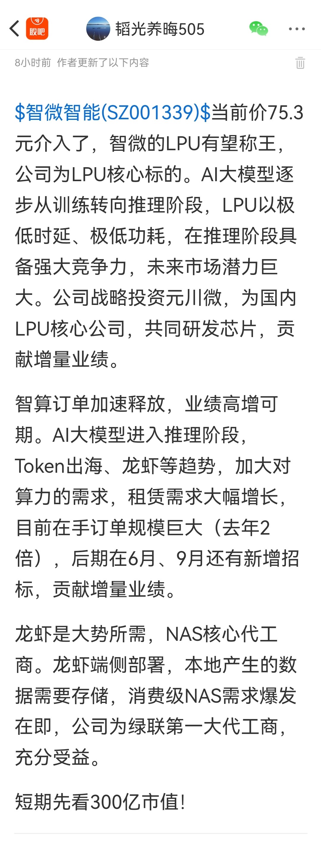 $智微智能(SZ001339)$打错了买入价格,是75.3元,不改了。