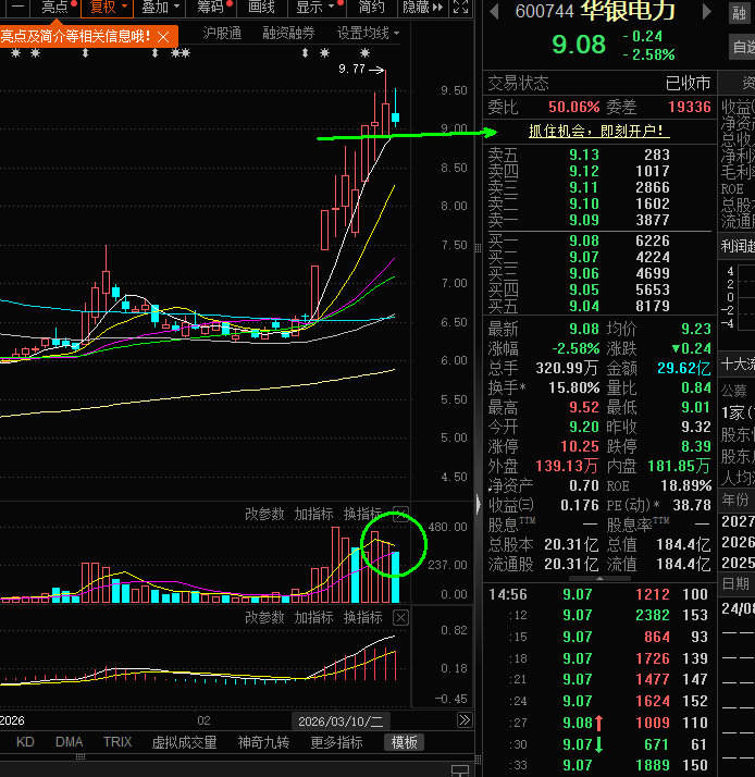 600744 华银电力:目前高点兑现,好在五日线支撑还在,需要看看会不会因为回踩9块钱走出强转弱,如果不能延续上涨趋势,及时撤离。