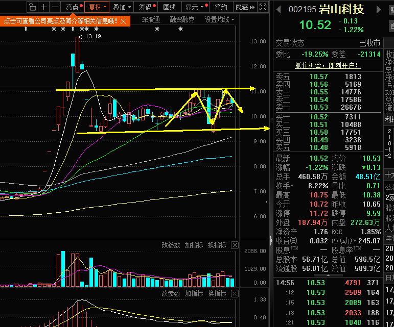 002195 岩山科技:目前量能依然没有呈现出放量上攻的表现,虽然下方支撑比较明显,如果在今天还没有出现积极信号,就选择放弃,不能把时间放在弱势股上面,尤其是持续的缩量会再次让进入箱体回踩的可能加大。