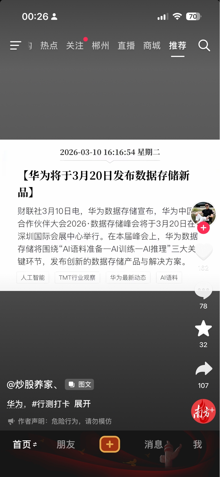 华为AI存储新品发布被视为算力-存储协同的关键转折,市场普遍将光迅科技列为核心受益标的之一。3月10日光迅科技股价涨停(+10%),也反映了市场对其与华为存储业务联动的乐观预期。