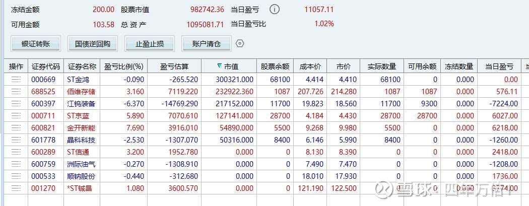 实盘一年10倍今天午休持仓,今天赚钱的票出来了一些,重仓操作000669,000711一字板继续格局,可惜进少了,688525和600397没有卖点继续格局。回撤小是翻倍翻10倍的基础和秘诀,赚钱快不一定能够翻倍翻10倍,但是回撤小一定可以翻倍翻10倍。还是要坚持分仓操作,满仓进一个除非是确定的龙头,否则风险太大,几次失误就可以腰斩,回撤太大想翻倍翻10倍就非常困难,继续见证我实盘一年10倍过程。