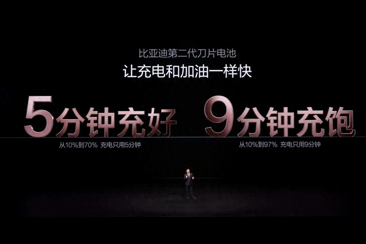 比亚迪通过长期技术积累,解决诸多电动化难题,最终实现了最高1500kW的充电功率,做到了“5分钟充好,9分钟充饱”,即“10%充电到70%仅需5分钟;从10%充电到97%仅需9分钟”。