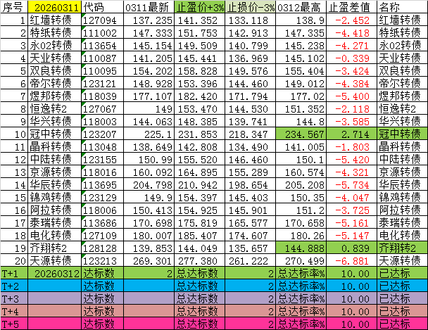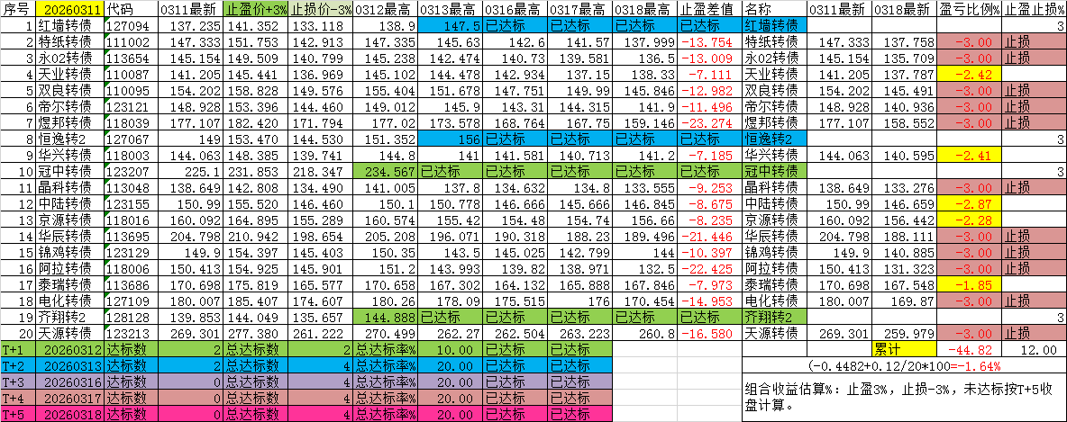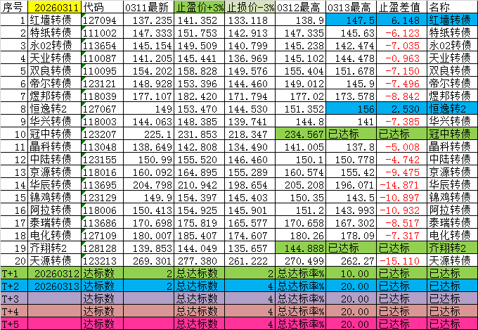 尾盘可转债(短线),每日尾盘14:40后,通过选债公式自动选择一批可转债标的,一周内大于3%收益的概率(五个交易日,以最高价计算)。盘中采用其他方式公布,本平台栏目不便及时发帖。为了计算方便,盘后以当日收盘价作为计算初始数据。
