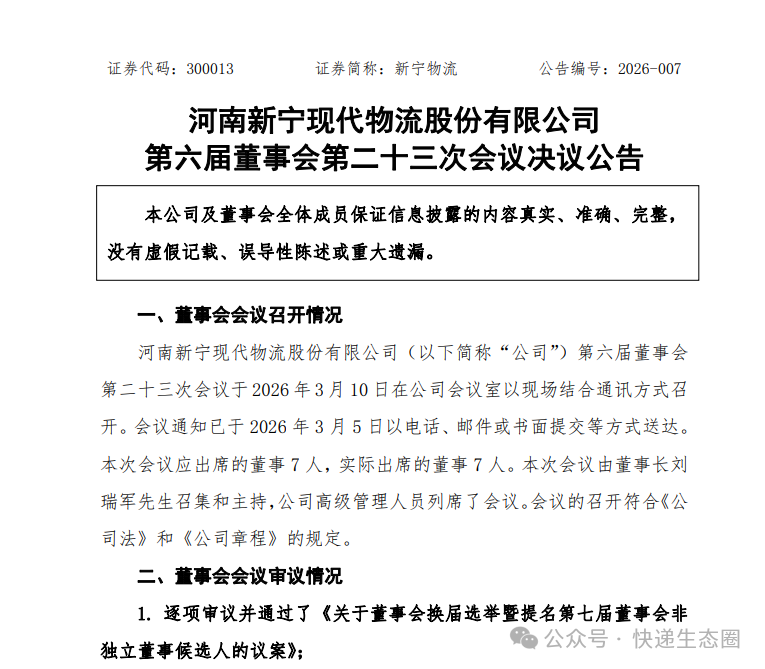$新宁物流(SZ300013)$河南新宁现代物流股份有限公司(以下简称“公司”)第六届董事会第二十三次会议于 2026 年 3 月 10 日在公司会议室以现场结合通讯方式召开。
