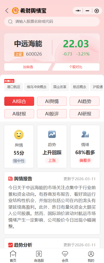 $中远海能(SH600026)$ 昨天(3.11)关于中远海能的市场关注点集中于行业前景和资金动向。有券商发布报告,看好油运行业结构性机会,并指出包括公司在内的龙头有望延续高盈利。此外,昨日有量化资金大额买入公司股票。然而,国际油价波动对航运市场情绪产生一定影响,公司股价今日出现小幅调整。