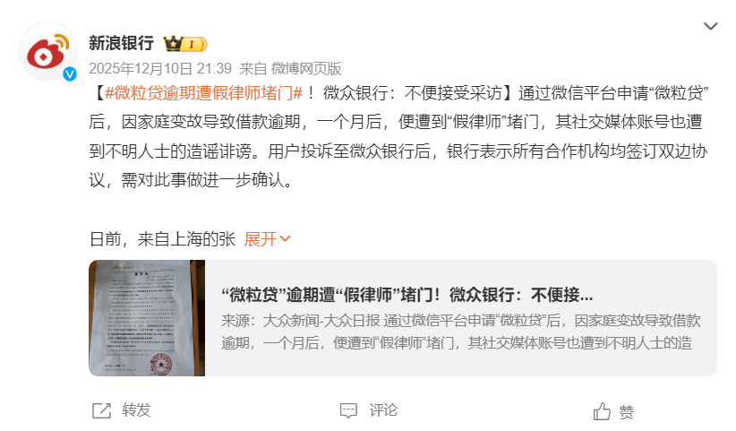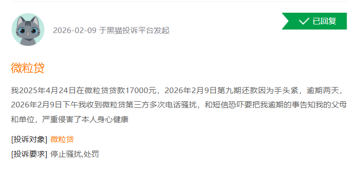2月9日,一位用户投诉称:“我2025年4月24日在微粒贷贷款17000元,2026年2月9日第九期还款因为手头紧,逾期两天,2026年2月9日下午我收到微粒贷第三方多次电话骚扰,和短信恐吓要把我逾期的事告知我的父母和单位,严重侵害了本人身心健康。”