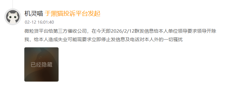 2月12日,另一位用户表示:“微粒贷平台给第三方催收公司,在今天即2026/2/12群发信息给本人单位领导要求领导开除我,给本人造成失业可能现要求立即停止发信息及电话对本人外的一切骚扰。”
