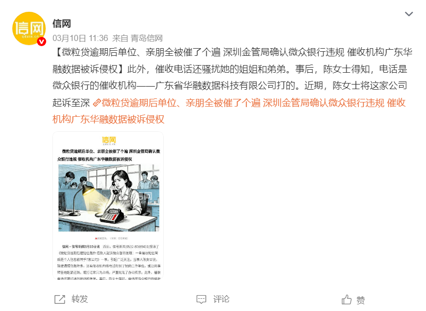 2025年3月,陈女士向国家金融监督管理总局深圳监管局投诉,随后,监管部门确认了催收源头为深圳前海微众银行股份有限公司,也就是微粒贷的运营公司,并且在工信部电信网码号资源使用和调整审批系统查到了发送催收短信的公司名称。