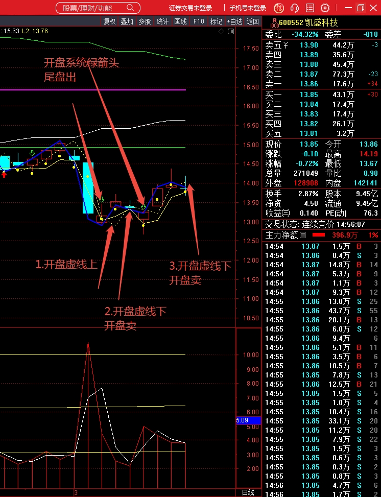 开盘系统,能直观看到红绿箭头,假如持有之后,红绿箭头未至可参考虚黄线把握其买卖点,如上一日开盘价在虚黄线之上,而今日开盘虚黄线之下,则挂虚黄线卖出。卖出之后,转“尖锋系统”1倍线挂单买回。