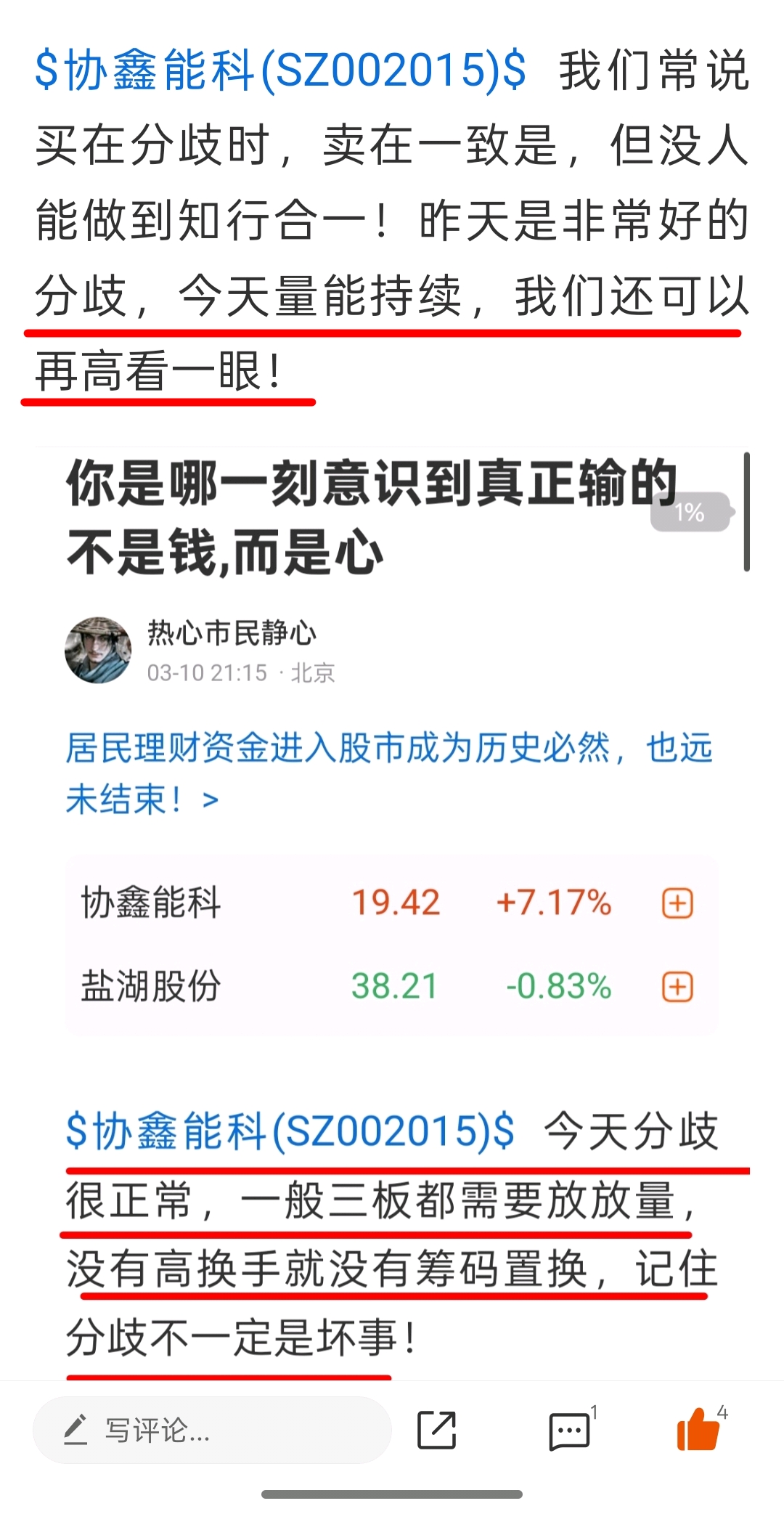 再讲讲$协鑫能科(SZ002015)$ 前天的时候我说过三板分歧不是坏事,一直向上就需要换手,筹码的置换,并且昨天是持续放量的,也说了继续高看它一眼,今天溢价涨停!那么接下来持续关注量的变化就可以了!