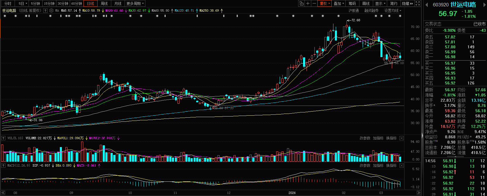 世运电路:PCB赛道核心标的,受益于英伟达20亿战略投资AI算力、OpenClaw相关AI硬件需求爆发,同时制造业成本压力缓解,企业盈利预期提升,昨日回调属于主力洗盘,早盘曾逆势冲高,午后随板块回调但资金承接有力,筹码换手充分,为今日拉升蓄力;今日PCB板块资金回流,叠加多重催化,今日回踩铁底不破必将反弹破位,收复失地。纪律不变,坚守铁底不破,继续格局