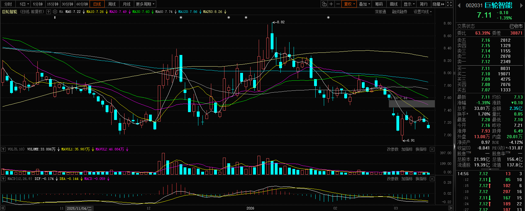 巨轮智能:机器人赛道核心标的,主营机器人核心部件RV减速器,受益于具身智能场景落地(药品零售机器人上岗),人形机器人产业景气度持续提升,,等待机器人板块回暖启动,铁定会跟随反攻,目前看齐上方缺口回补。坚守铁底不破,继续格局