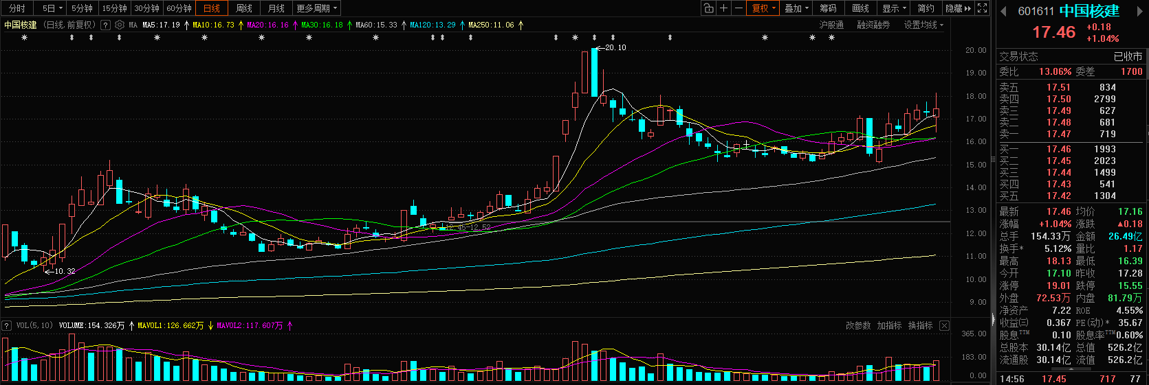 中国核建:核电+储能双主线龙头,精准贴合全国首个民资参股核电项目并网、“十五五”核电政策加码两大催化,作为核电建设国家队,直接受益于核电审批加速和民资参与政策,昨日在大盘普跌、主力资金整体出逃的背景下,逆势上涨1.04%,彰显强大韧性,主力资金净流出属于短期调仓,筹码结构优化,今日借力政策东风,大概率跟随上升,铁底不破跟随吃主升浪。