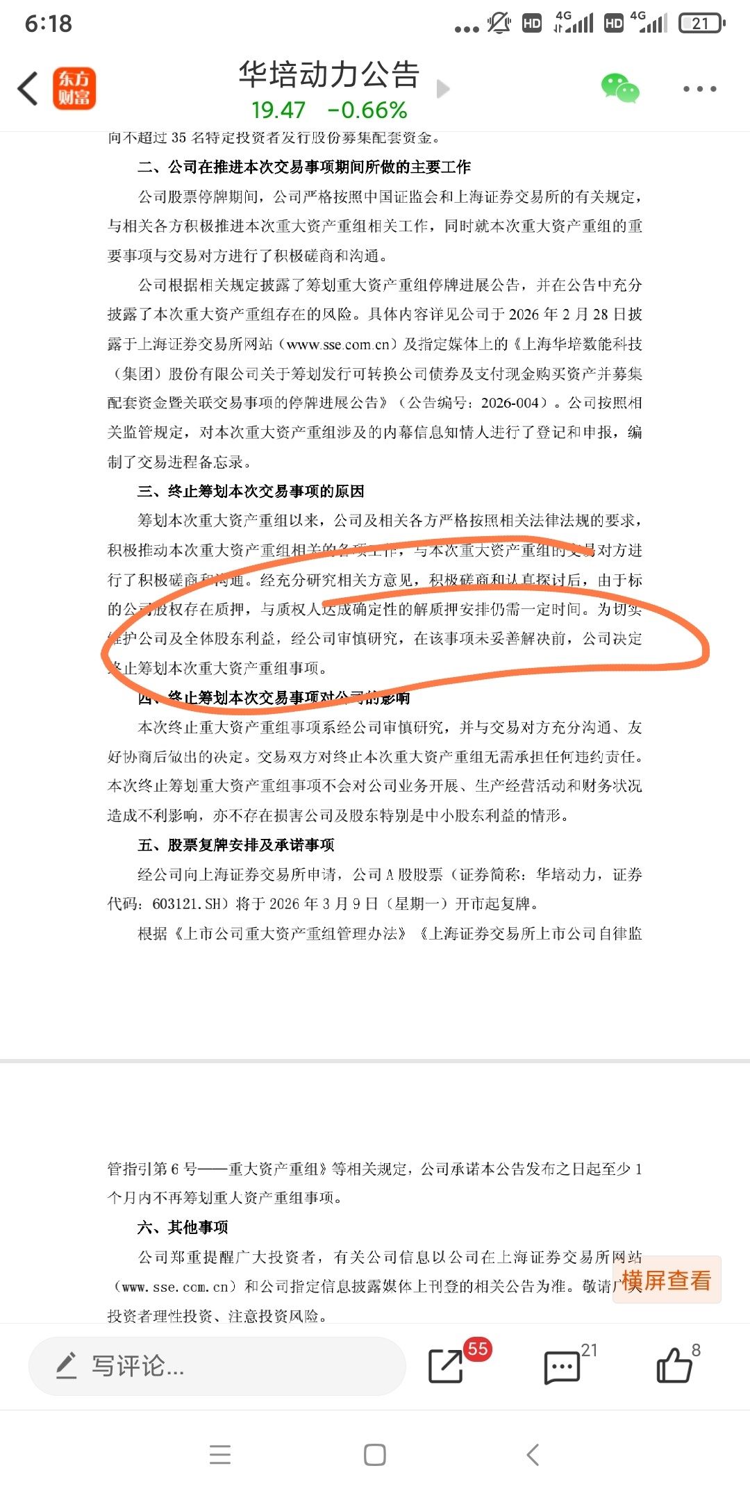 3 月 7 日,华培动力发布重大资产终止公告,该公司称,经充分研究相关方意见,积极磋商和认真探讨后,由于标的公司(指美创智感)股权存在质押,与质权人达成确定性的解质押安排仍需一定时间。为切实维护公司及全体股东利益,经公司审慎研究,在该事项未妥善解决前,公司决定终止筹划本次重大资产重组事项。