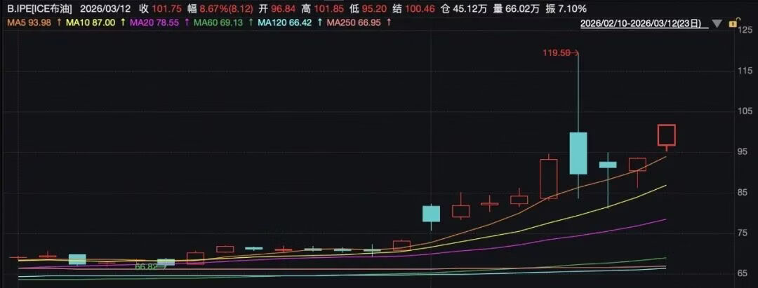 声明发表后,油价继续上行,下图,是布伦特原油的日K,虽然本周一油价一度飙升到了120美刀附近,但是按日终结算价看,这是2022年俄wu以来,油价首次突破100美刀,可见事态之紧张。