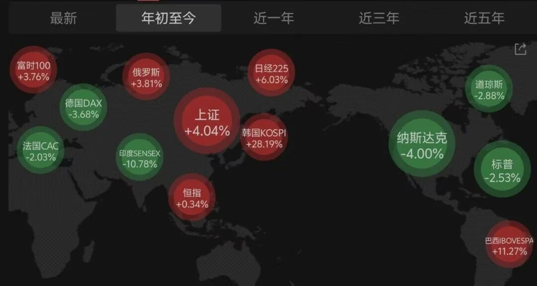 我们也要看到,截至今早来盘,日韩股市双双低开,下图,是年初以来,全球主要股指的表现,可以看到,美欧股市整体已转跌,而东亚股市表现相对较好。