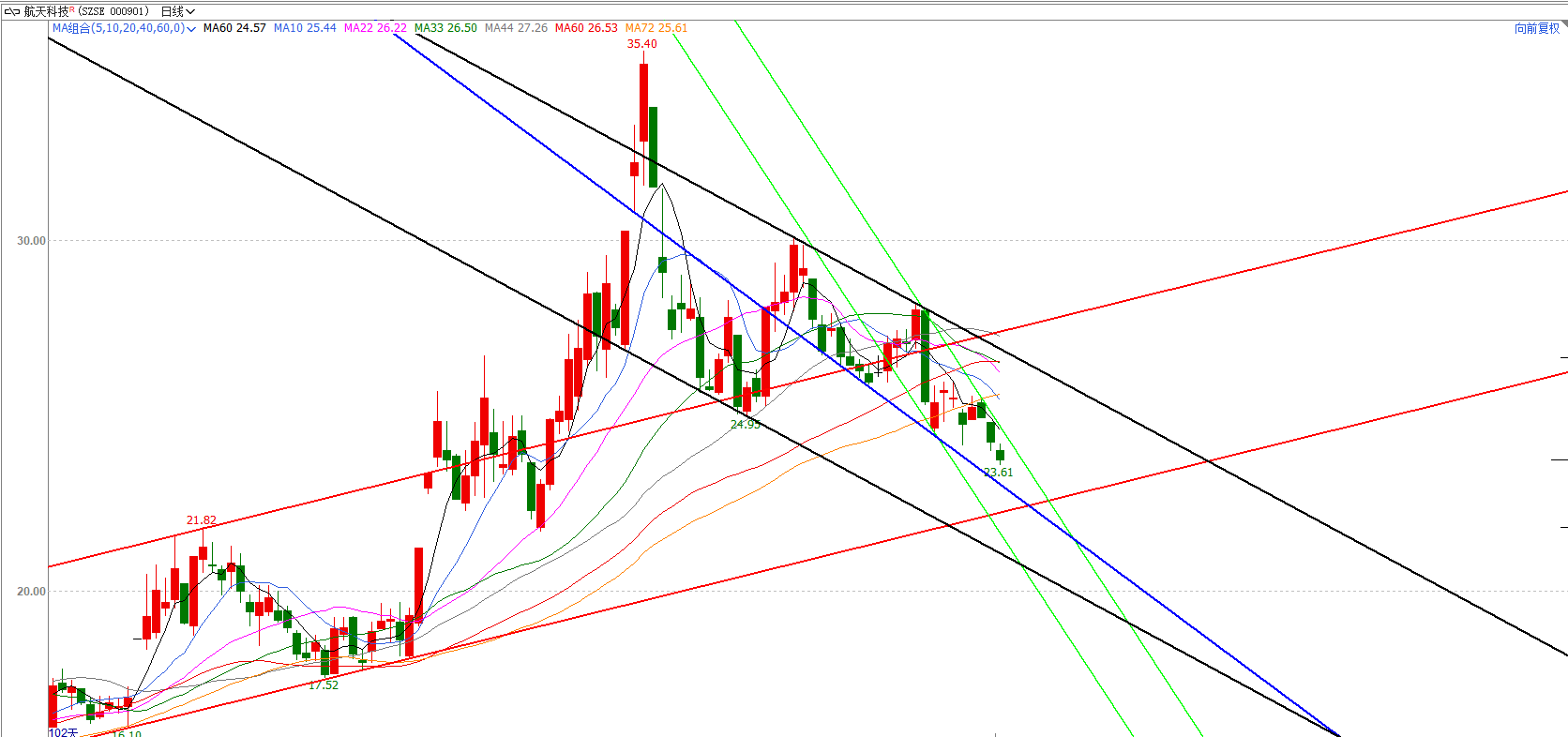 绿色的阻支区间主要目的是跟跟踪投资标的下跌的方向,斜率,波动范围。投资标的应当在绿色的阻支区间内震荡下行,向上突破绿色的阻力线,投资标的在黑色阻支区间内震荡下跌。一旦向上突破黑色的阻力线,都代表投资标的下跌趋势有可能结束。在下跌过程中将会得到蓝色阻支线、红色支撑线的支撑。预测止跌的价格在22.21至22.48,如果这个价格没有支撑住下跌,之后的支撑价格分别是21.49、20.67、19。只要价格不跌破红色支撑线,整体大的上升趋势就没有变化。