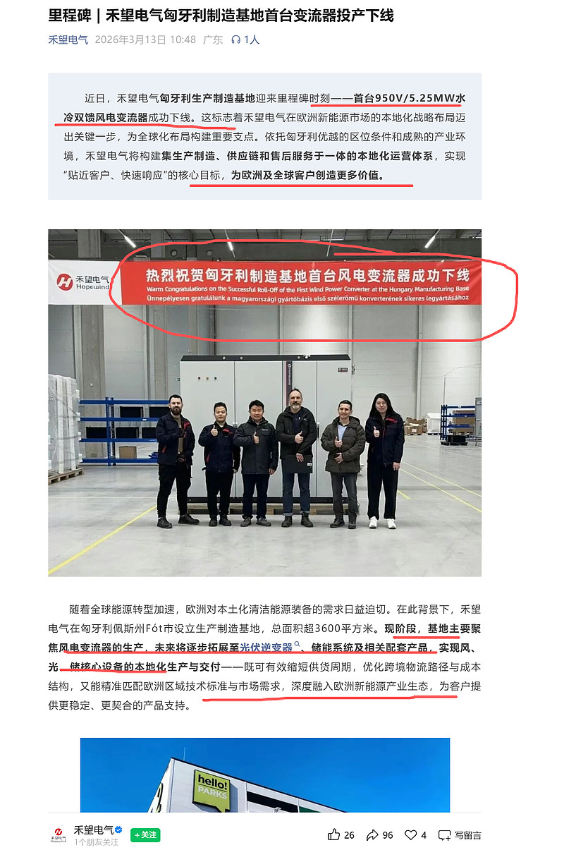 禾望电气在匈牙利生产的950V/5.25MW水冷双馈风电变流器采用模块化设计,搭载2300V IGBT,功率密度提升。其海上型产品具备抗盐雾腐蚀、远程运维等特性,已支撑全球最大26MW海上风电机组并网,采用智能冗余设计保障可靠性。
