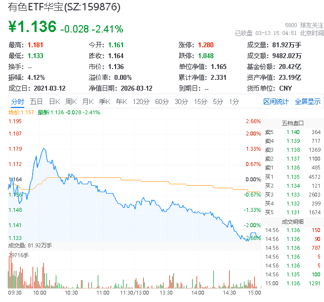 热门ETF方面,有色ETF华宝(159876)场内价格上涨0.69%,成交额达4668.68万元。