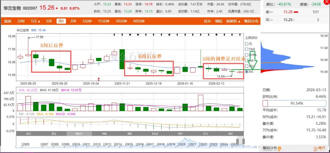 华兰虽然走的很弱,但最近倒也走的可以接受!上周的日K线组合就预期了一下,是否会复制前期的中枢震荡,当前就在下方14.94-15.30的中枢内震荡,完成下方震荡后再突破向上进入15.30-15.70的上方的对称震荡,然后在借某一个利好消息再度攻击17一线的大中枢,连续几个大中枢的震荡,基本就把底部筑牢了!上周五预判的走势没有走出来,一是站上15.28二是周K线收到15.35上方,目标虽然没有完成,但离目标并不远!