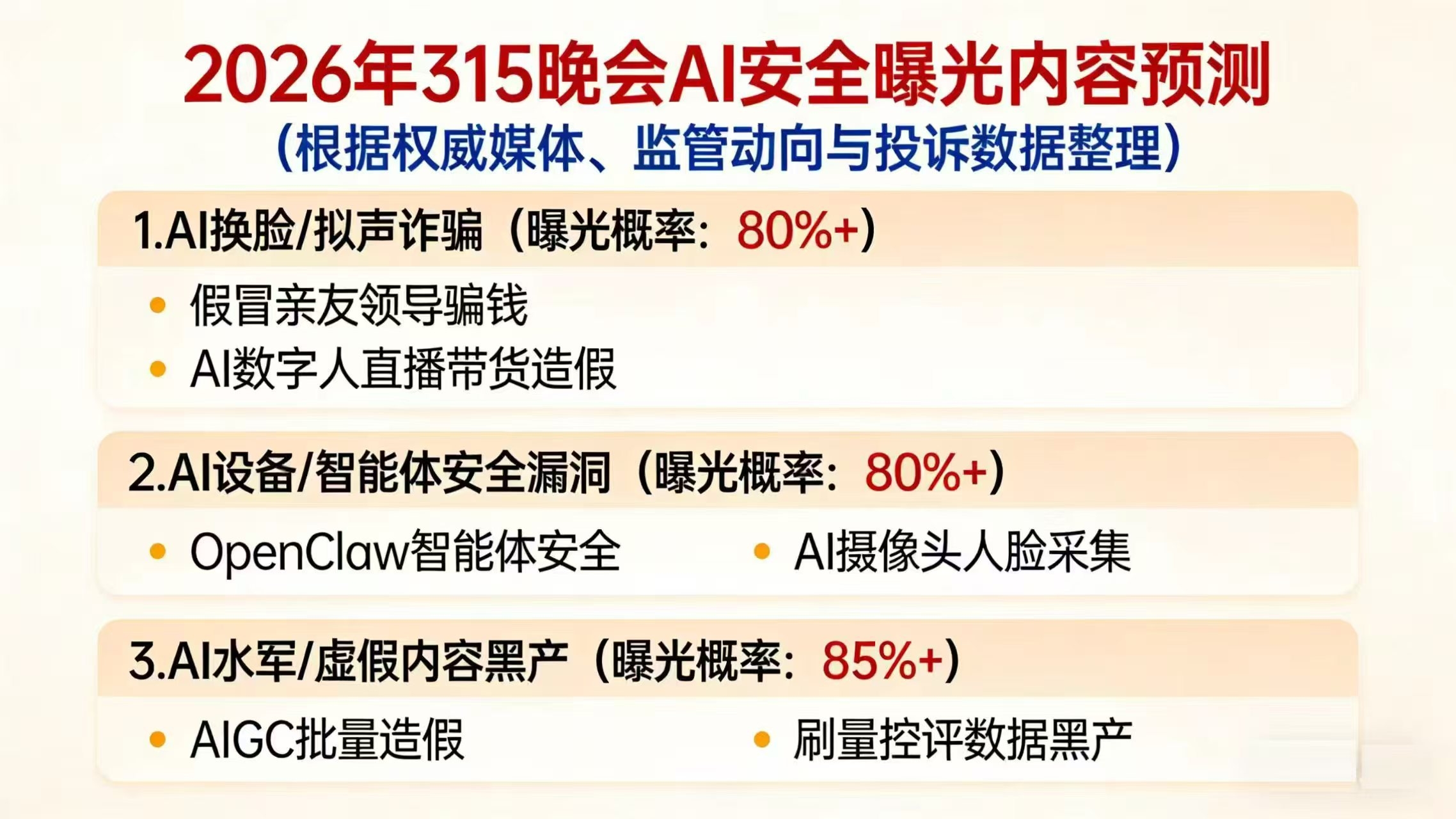 $国投智能(SZ300188)$ $三六零(SH601360)$ 本周末即将迎来 2026 年 315 晚会,从权威媒体、监管动向及用户投诉数据整理的预测来看,AI 安全领域大概率成为本次晚会的核心曝光方向,相关风险事件极易在周末持续发酵,成为下周市场的核心情绪锚点。从预测清单来看,三大 AI 安全场景的曝光概率均超过 80%:其一,AI 换脸 / 拟声诈骗(曝光概率 80%+),包括假冒亲友领导实施转账诈骗、AI 数字人直播带货造假等典型案例,这类诈骗依托生成式 AI 技术低成本快速扩散,已造成多起民众财产损失,极易被晚会重点披露,引发全民对 AI 滥用的警惕;其二,AI 设备 / 智能体安全漏洞(曝光概率 80%+),涉及 OpenClaw 智能体的权限越界风险、AI 摄像头过度采集人脸数据等隐私泄露问题,直指智能硬件的合规短板;其三,AI 水军 / 虚假内容黑产(曝光概率 85%+),AIGC 批量生成虚假图文 / 视频、刷量控评的数据黑产链条,不仅扰乱内容生态,更可能干预舆论与金融市场,是当前监管治理的核心靶点,曝光优先级最高。从市场交易视角看,近期 AI 安全相关板块已连续多日调整,资金情绪偏谨慎,恰好形成 “人弃我取” 的布局窗口。一旦 315 晚会曝光具体案例,周末舆情将快速放大,周一市场会对 AI 安全治理、隐私保护、反诈技术等方向形成强催化,叠加量化语料加强带来的溢价效应,相关标的有望迎来短期情绪修复与估值修复的共振行情,具备明确的博弈价值。