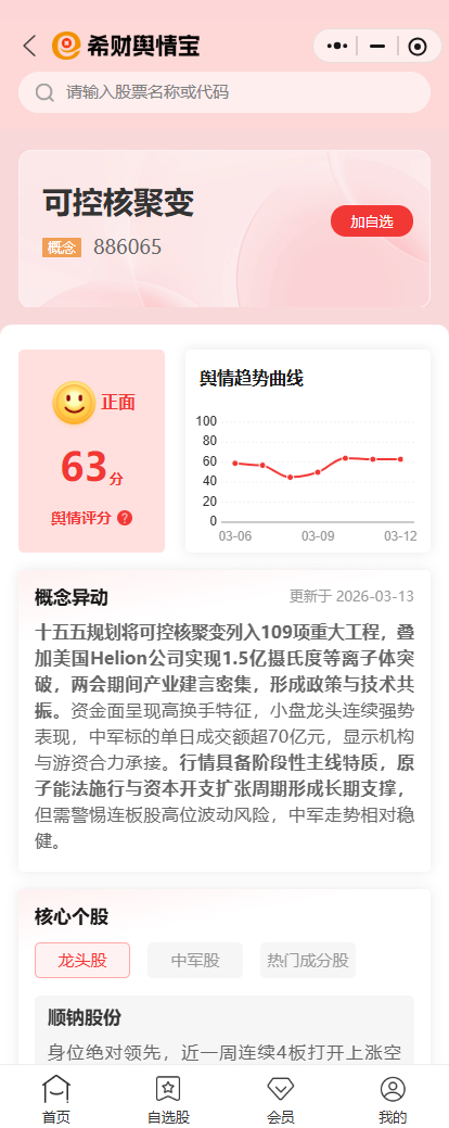 希财舆情宝上更新了近期关于可控核聚变概念异动情况的最新分析——十五五规划将可控核聚变列入109项重大工程,叠加美国Helion公司实现1.5亿摄氏度等离子体突破,两会期间产业建言密集,形成政策与技术共振。资金面呈现高换手特征,小盘龙头连续强势表现,中军标的单日成交额超70亿元,显示机构与游资合力承接。行情具备阶段性主线特质,原子能法施行与资本开支扩张周期形成长期支撑,但需警惕连板股高位波动风险,中军走势相对稳健。