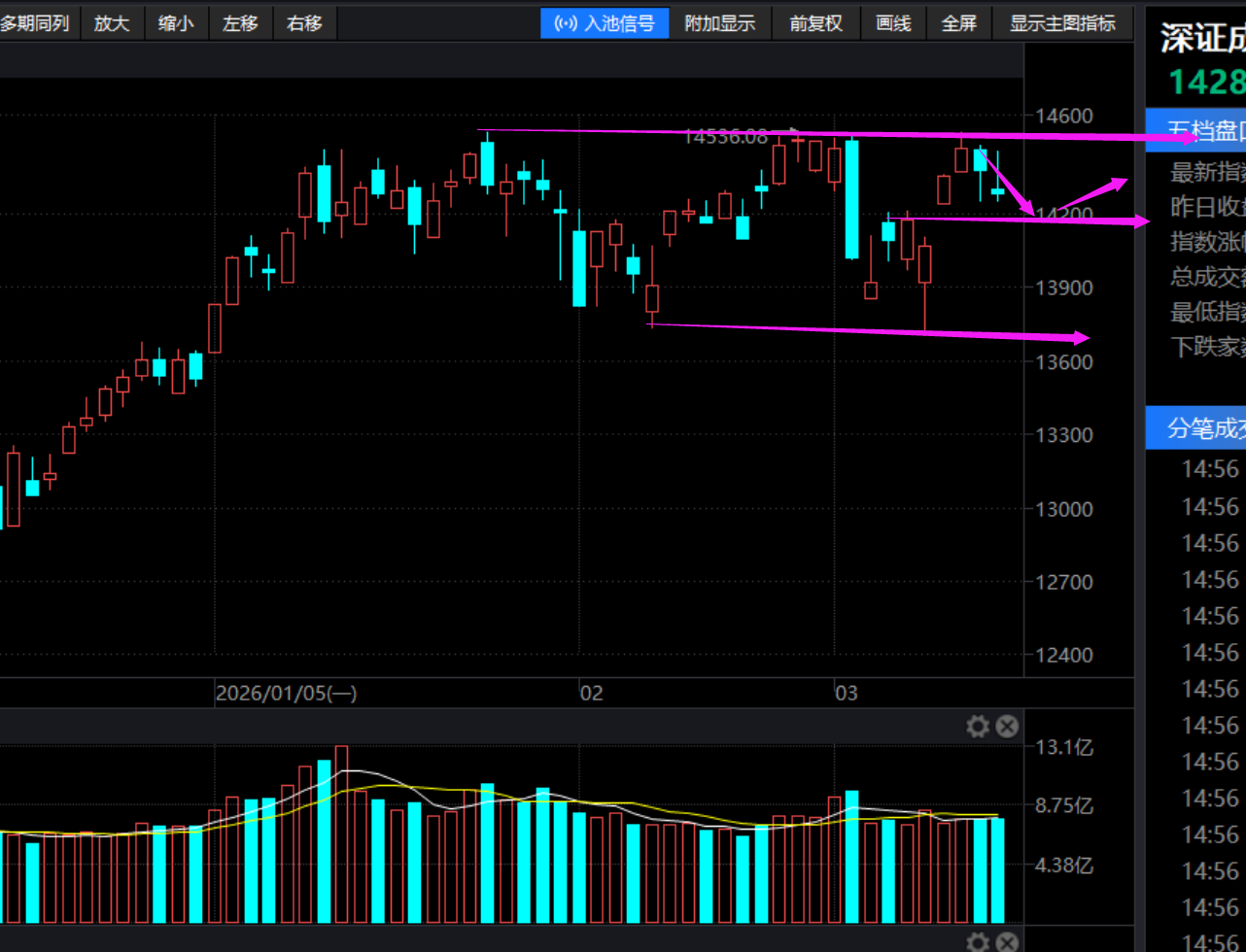 深成指:放量回踩已形成,关注14174是否会形成有效支撑,进而反转。否则就得去60日均线位置。