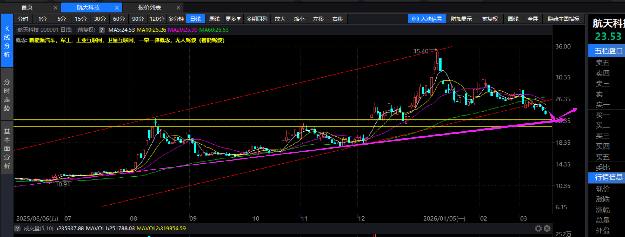 航天科技:今天缩量下跌破了三角整理区,明天大概率还会下跌,目前将两年最低位置连线作为最后支撑线,2025.12.12盘争区底部作为二次支撑测试,关注22--22.44能否止跌,否则就得补21的缺口,大波段上涨趋势算是破坏完了,但又不得不说21附近是最强支撑,两个波段高点加跳空缺口。