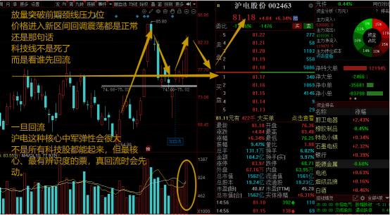沪电今天是明显的放量强修复,收 81.18 元,涨 6.34%,盘中最高摸到 83.48 元,成交额超过 100 亿元。这说明今天虽然大盘整体一般,但资金对“PCB/算力硬件核心票”的回流是真实存在的。前面我们一直说,科技线不是死了,而是看谁先回流;一旦回流,沪电这种核心中军弹性会很大。今天这句话就兑现了。也就是说,不是所有科技股都能起来,但最核心、最有辨识度的票,真回流时会先动。