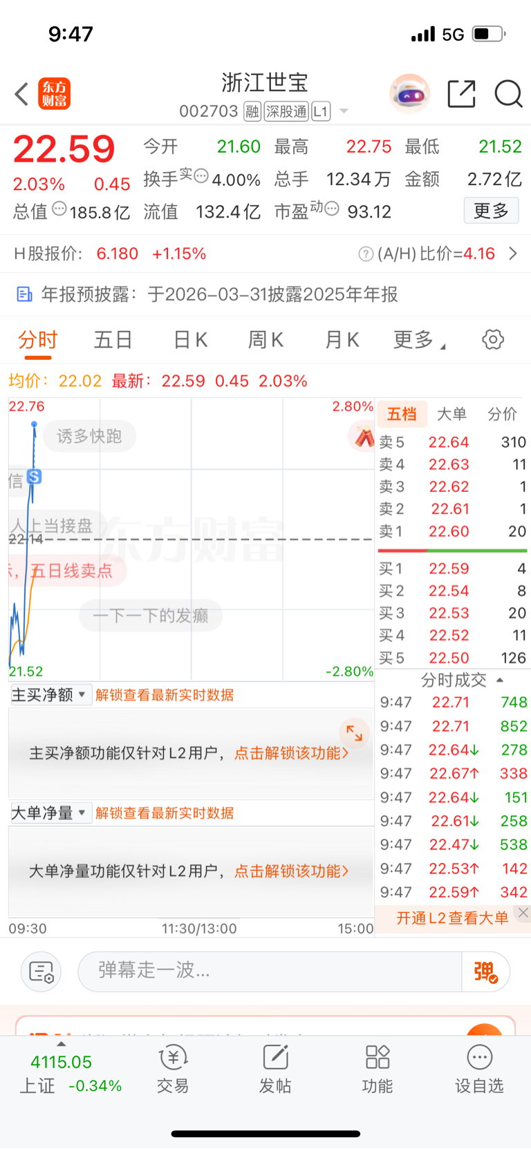 2.浙江世宝,昨天很多朋友说小胡选的世宝很一般,但是很明显只要无人驾驶一有风吹草动,世宝的反应极其迅速,龙头位置可见一斑,今天22.65卖出昨日22.29元买入的3000股,成本从23.39元降低到23.03元,今天也有机会走但是小胡不想走,走了我又要乱选股了,还是格局到下周,目前短期反弹价格区间在24-24.5元,我能等![大笑 [大笑]](http://gbfek.dfcfw.com/face/emot_default_28x28/emot2.png)