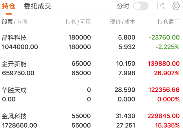 金开新能:今天早盘竞价阶段就明显承压,抛压不小,开盘后一度高开,随后快速向下探,叠加风电绿电板块整体走弱共振,股价进一步下探,走出了较大幅度的调整走势。结合之前连续的上行节奏,当前个股已到高位区域,面临明显分歧,高位震荡与短期消化在所难免。为守住既有收益,今天在10.69这个位置先行做了减法,短期先控制节奏、保持谨慎。接下来重点观察后续板块能否回暖,以及个股能否在五日均线位置有效企稳、承接转强,再视情况考虑是否回补。