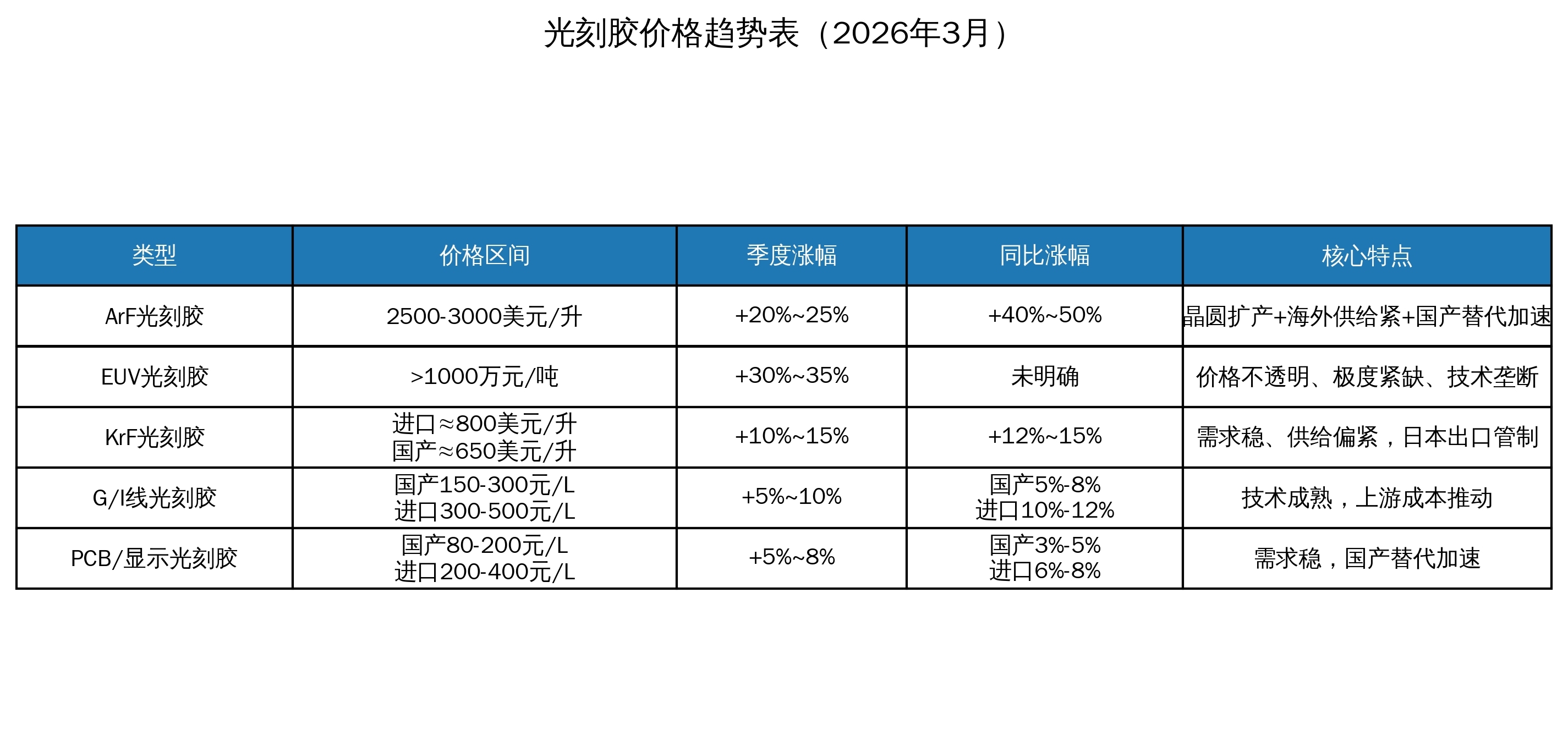 $南大光电(SZ300346)$ 2026年光刻胶价格呈结构性分化,高端光刻胶(ArF/EUV/KrF)持续大幅上涨,中低端(G/I线/PCB/显示)温和上涨。