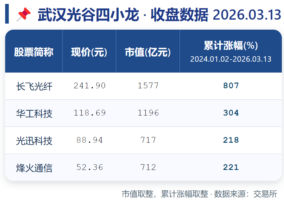 长飞光纤、华工科技、光迅科技、烽火通信,这四家公司市值升至武汉光谷TOP4,被市场称为“武汉四小龙”。它们正以一种联袂上涨的气势,把这座“光谷”推向C位。