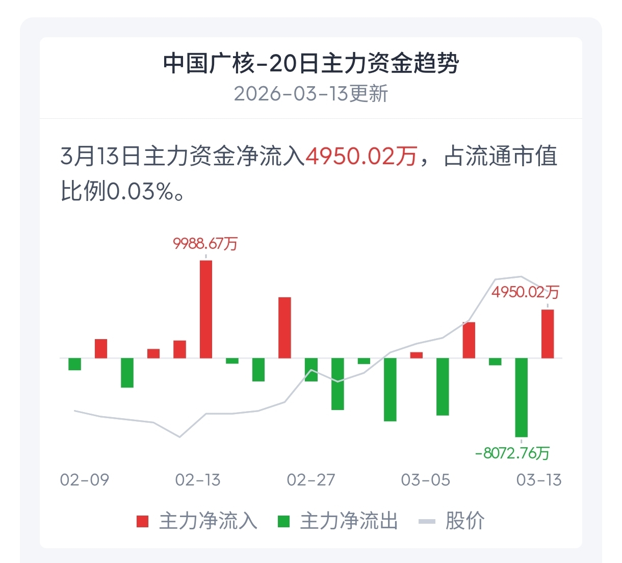 市场避险情绪与板块轮动助推资金流入,截至2026年3月13日收盘,中国广核主力资金呈现净流入状态,单日净流入额约4950万元。这一动向主要受市场整体情绪谨慎驱动,近期地缘冲突推高避险需求,资金从高估值科技板块向防御性资产转移。电力及公用事业板块作为低估值、高股息代表,吸引主力资金布局,以规避波动风险。