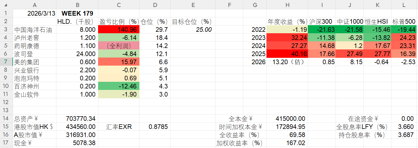 本周继续调仓,账户主要受益于中海油H延续涨势创历史新高,首次站上70.00w。