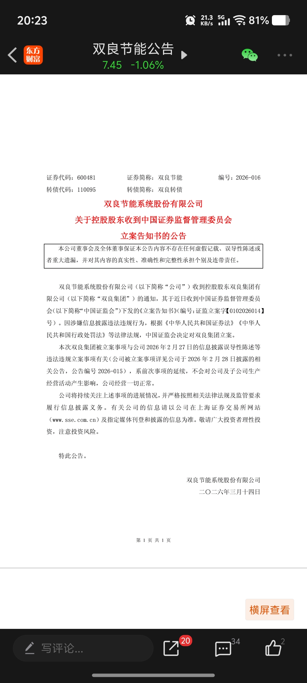$双良节能(SH600481)$ 2月28号公司才被立案调查。