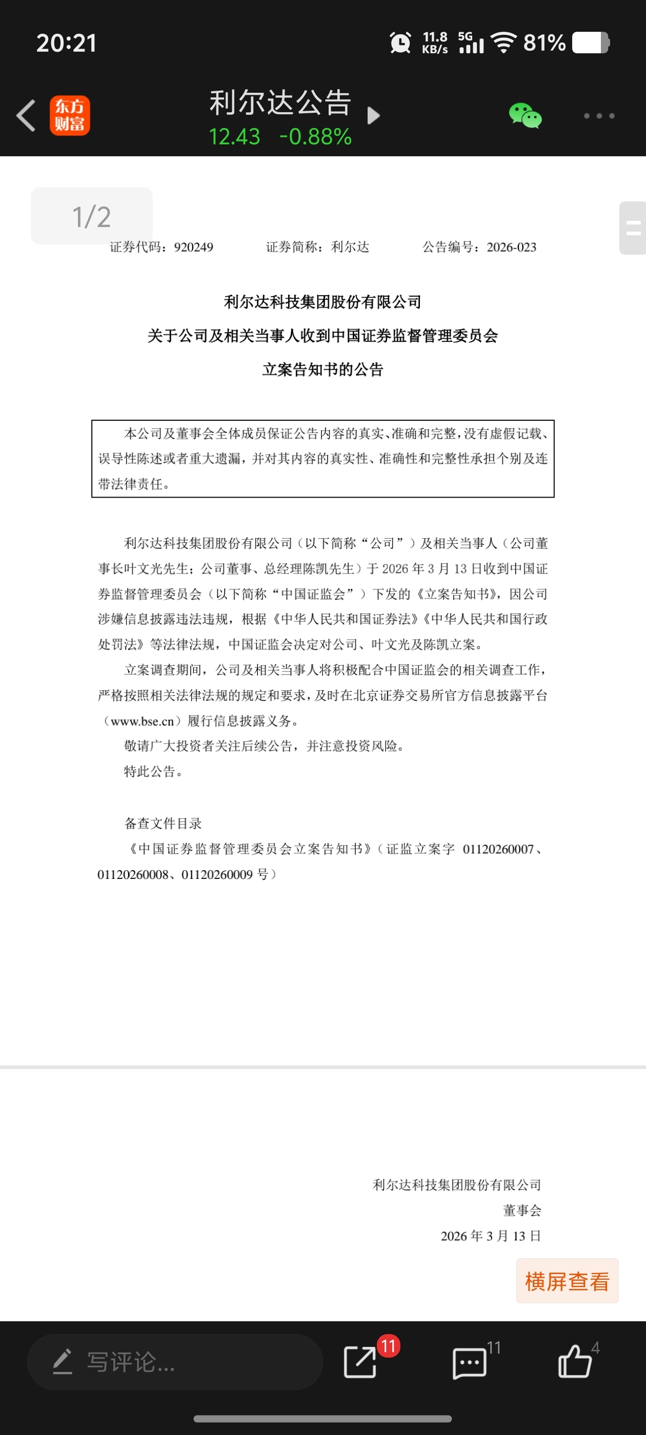 $利尔达(SZ920249)$ 今天也被立案调查了。并且是直接公司董事长,总经理三方同时被立案调查。