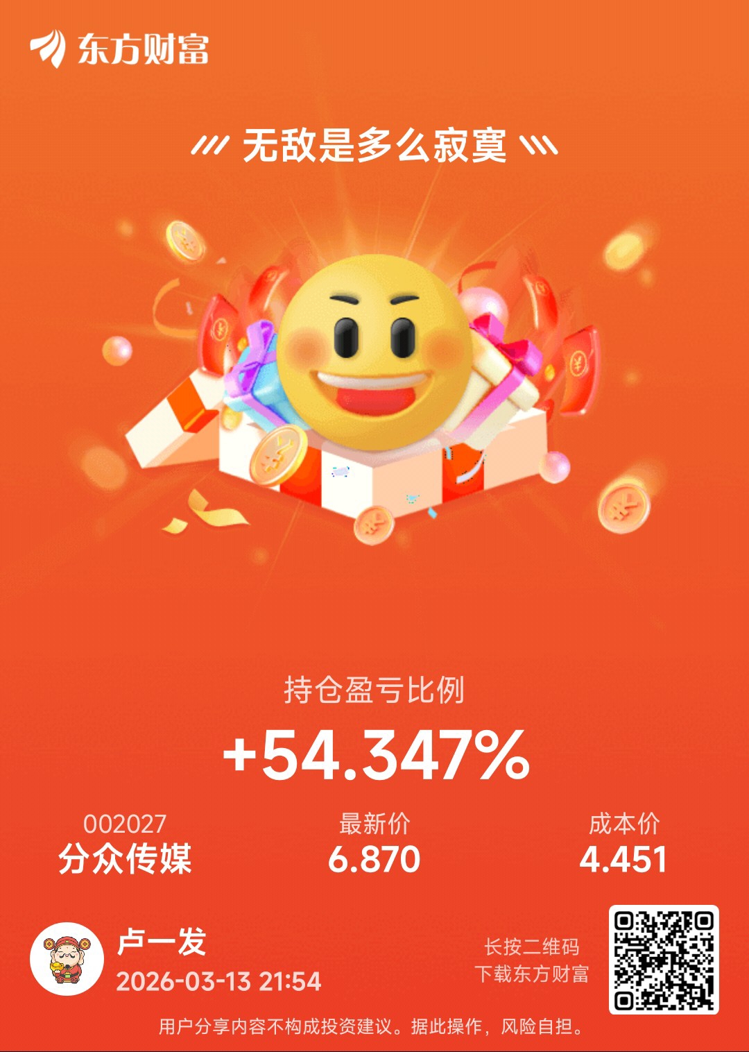 $分众传媒(SZ002027)$ 我记得2022年10月行情最底部的时候,分众最低跌到了4.8左右,假设一个人在最底部全仓买进,拿到现在加上分红也就差不多一倍的收益,3年1倍看上去也不错,毕竟7亏2赚1平,然而大多数人都是分批加仓,不可能正好在最底部全仓梭哈。