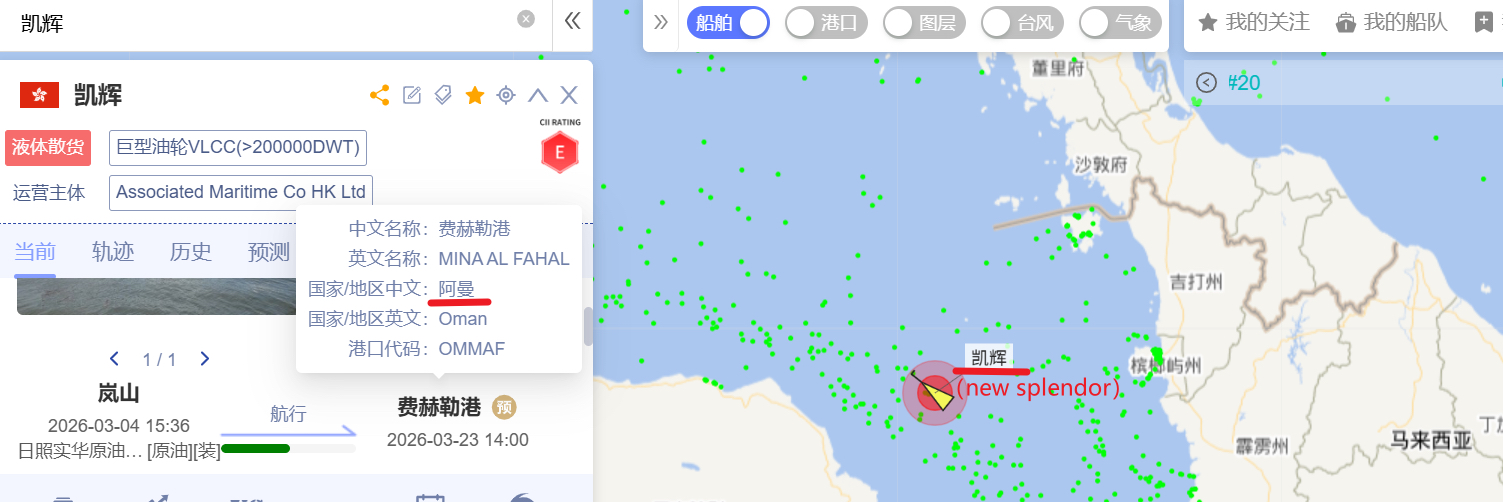 (3)图4 new splendor(凯辉)目的地Oman费赫勒港,在霍尔木兹海峡外。