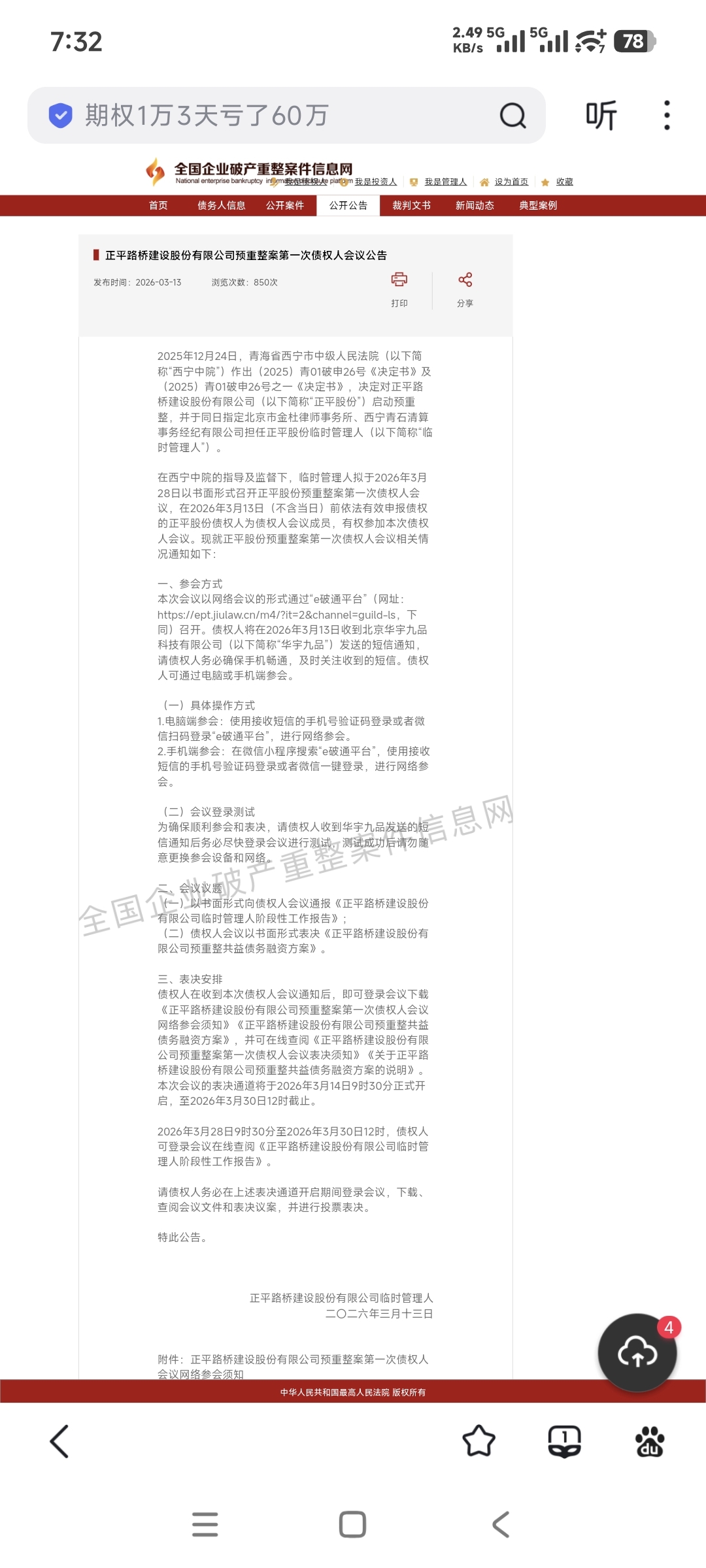 2026年3月28日9时30分至2026年3月30日12时,债权人可登录会议在线查阅《正平路桥建设股份有限公司临时管理人阶段性工作报告》。