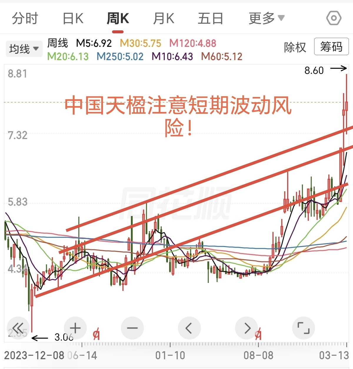 中国天楹第一目标价位7.37 波动上沿7.71 波动下沿7.03 第二目标价位8.98 波动上沿9.19 波动下沿8.77 周五最高价8.6基本上触及到了波动下沿区域,无论主力是否继续向上拉升,此时风险大于机会!就算主力强行拉第三目标价位也极难把握,而且剩余的涨幅并不大!重点看下周一,如果不能再创新高那么就大概率将再次回踩第一目标价位波动区间, 震荡之后将再次向第二目标价位8.98拉升!