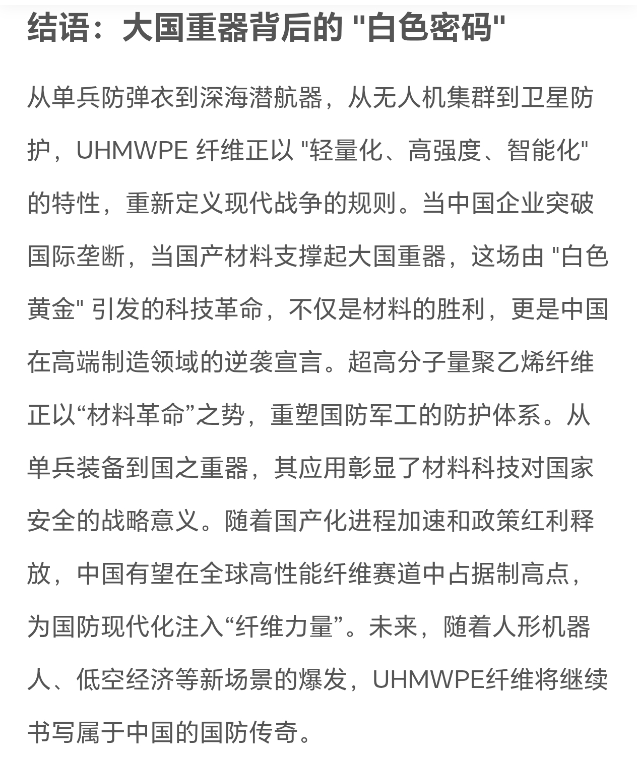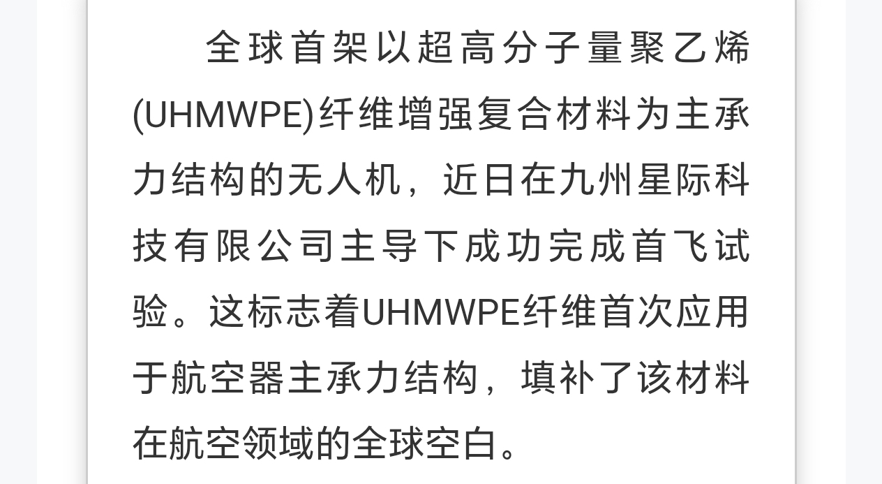 $同益中(SH688722)$ UHMWPE(超高分子量聚乙烯)纤维被广泛认为是军用与民用无人机的理想材料之一,尤其在轻量化、高强度、抗冲击和透波性等方面具有显著优势。结合最新公开资料,其作为“最佳选择”的主要原因如下:核心优势极致轻质高强:UHMWPE纤维的强度是优质钢材的15倍,而密度仅为0.97–1.3 g/cm³,比水还轻,可大幅减轻无人机结构重量,提升续航与载荷能力官媒。优异抗冲击与损伤容限:其抗冲击性能达碳纤维复合材料的3倍以上,受冲击不易脆断,更适合复杂环境下的飞行安全。全频段电磁透波性:GPS、5G、数传、图传等无线电信号可无损穿透UHMWPE复合材料,无需额外天线开窗,简化结构设计并提升信号稳定性。减重即增程效果显著:以主流工业无人机为例,采用UHMWPE复合材料后,在相同电池和载重条件下:续航比铝合金提升 35%–40%比玻璃纤维复材提升 20%–25%比碳纤维复材提升 15%–20%结构完整性好:材料可一体化成型,减少连接件和接缝,提升整体气动效率与可靠性。