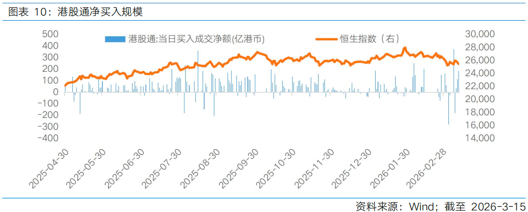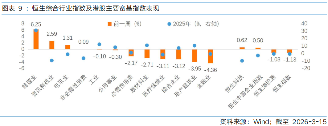 (3)地缘局势:霍尔木兹海峡梗阻,能源价格主导市场情绪。美以对伊朗发动军事打击后,霍尔木兹海峡航运几乎完全中断。海运数据显示,3月1日至今仅77艘船只通过该海峡,而去年3月1日至11日同期通过量高达1229艘。冲突爆发以来,至少18艘油轮等商船在波斯湾海域遭袭,航运风险激增。IEA虽协调释放约4亿桶石油储备,但战争持久化预期仍主导定价,油价不跌反涨。对港股而言,地缘冲突的影响体现在两个层面:其一,风险偏好全面压制。全球资金从新兴市场风险资产中撤离,港股科技等成长板块首当其冲,尽管周内AI相关主题受消息提振短暂活跃,但整体涨幅受限。其二,行业结构性分化加剧。油价飙升直接利好能源板块,能源业连续两周大涨即是对此的明确反映;而航空、零售等消费板块则因燃油成本上升和通胀压制需求而承压。