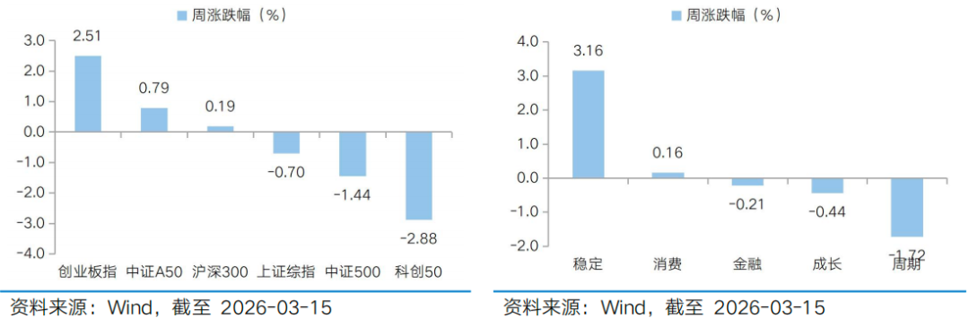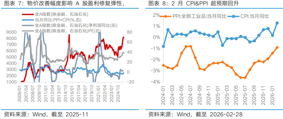 国内方面,在经济渐进修复和2026年“稳中求进、提质增效”政策取向下,市场结构性行情或将延续,短期来看,上市公司年报和一季报密集披露期临近,涨价和业绩有望成为把握结构性行情的抓手。对比沪深300的盈利周期和物价周期,可以发现两者走势亦步亦趋,因此,物价改善的幅度会影响A股盈利修复的弹性,进而影响指数的高度。结构上当PPI趋势向上时周期板块占优,当CPI温和通胀且趋势向上时消费板块占优。本周公布通胀数据显示,2月CPI、PPI回升幅度均超出预期,后续若中东局势扰动加大推动油价超预期上行,不排除PPI转正时点较年中进一步提前,不过上游涨价向中下游的有效传导仍需看向需求端变化,在内需平淡的背景下,单纯依赖输入型通胀,很难将过高的成本向下转嫁。向后看,3-4月作为传统经济活动旺季,国内涨价线索或更加丰富,叠加海外地缘局势催化,涨价主线仍是市场重要关注。另一层面,随着上市公司年报和一季报披露期临近,业绩因子对市场的影响权重也将不断增大,在当前流动性层面存在约束下无业绩支撑的高估值题材股或面临一定压力,关注绩优主线。