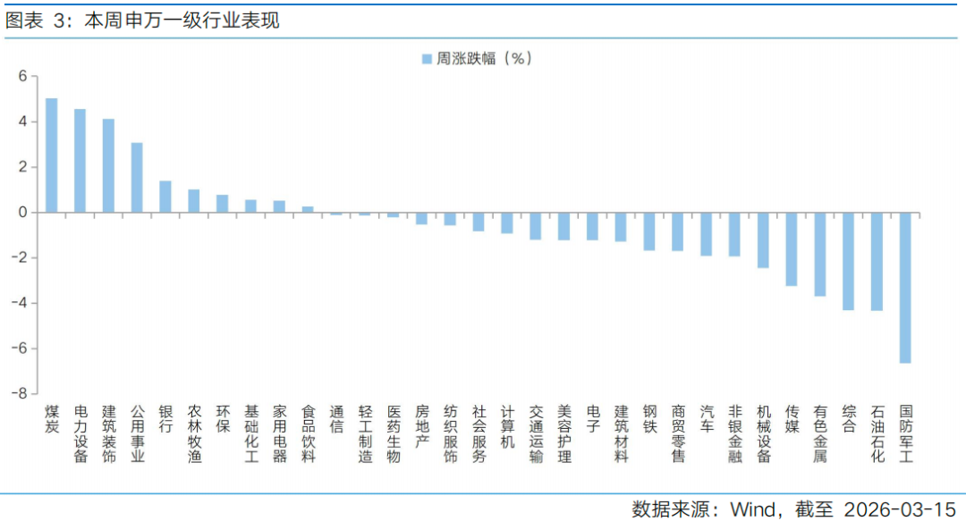 短期来看,海外地缘局势不确定性仍存,市场风险偏好受到压制,趋势性行情仍需等待;随着上市公司年报和一季报密集披露期临近,业绩主线有望回归。中长期看,“十五五”开局政策积极,央行维持低利率环境、政策呵护资本市场的态度没有改变,高利率存款陆续到期,居民资金有望逐步入市,A股长期慢牛的逻辑未改。行业配置:一)涨价主线:关注有色、煤炭、化工、农产品等。二)出海主线:关注优势产业的出海逻辑验证,关注电力设备、机械设备等。三)科技成长:关注具备景气支撑的AI基建链,包括算力、存力、电力;政策催化和产业进展或带来具身智能、航空航天、新材料新能源、生物医药等的结构性机会。