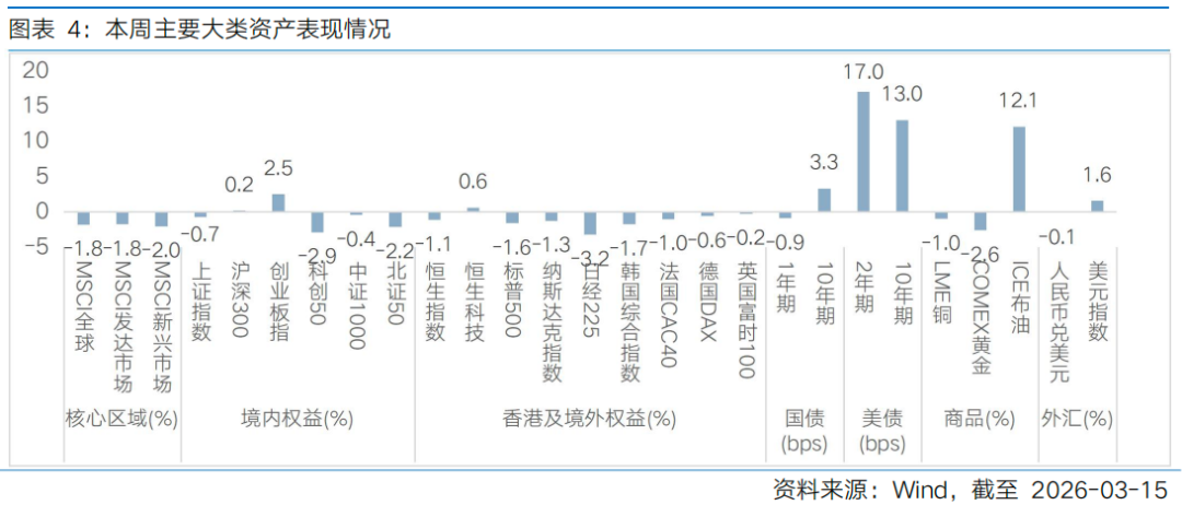 美伊冲突第二周,地缘紧张局势依然是本周全球市场叙事的核心,资产定价反映油价上涨引发的经济滞胀预期和流动性收紧预期。本周美伊冲突进入相持阶段,霍尔木兹海峡持续封锁,此外在冲突中,一些中东国家的炼油设施遭遇袭击,短期供给能力也受到影响,在此背景下原油价格继续呈现剧烈波动,本周布油价格盘中一度逼近120美元/桶,而后因特朗普称“战争即将结束”冲高回落,不过最终依然收于100美元/桶上方。上周我们提到,基于油价上涨→通胀预期抬升→降息预期下调→流动性冲击这条逻辑链,油价飙升会强化对于经济滞胀的担忧和“Higher for Longer”的鹰派预期,本周市场逐渐定价油价大涨下的经济滞胀预期和流动性收紧预期,全球股票、债券市场呈现不同程度回落,美元、原油偏强,后续持续关注美伊局势进展以及下周美联储议息会议声明。对于中国而言,经过近年来的优化调整,中国能源消费结构已变得更加多元,对单一能源的依赖度显著降低。目前,石油和天然气在中国一次能源消费中的占比仅为27.0%,且在石油资源供给端,我国的布局也较为多元。因此,从本轮中东局势升级以来,相较于日韩,A股彰显出相对韧性,不过在全球风险偏好承压和地缘紧张局势仍具不确定性的背景下,短期内A股或维持震荡格局。