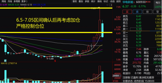 华电新能:华能集团旗下新能源核心平台,总装机超40GW,风电、光伏并举,海上风电规模稳居行业第一梯队,并深度参与“沙戈荒”大基地与治沙光伏项目,业绩稳健增长,电力板块前期涨幅大,今日随大盘走弱、内资流出,资金集体兑现;虽受益新能源政策,但短期技术面需修复。本周冲高不过 7.05 元建议获利离场;明日关注 6.5 元附近支撑企稳后,再考虑布局加仓;严控仓位,规避板块分化风险。