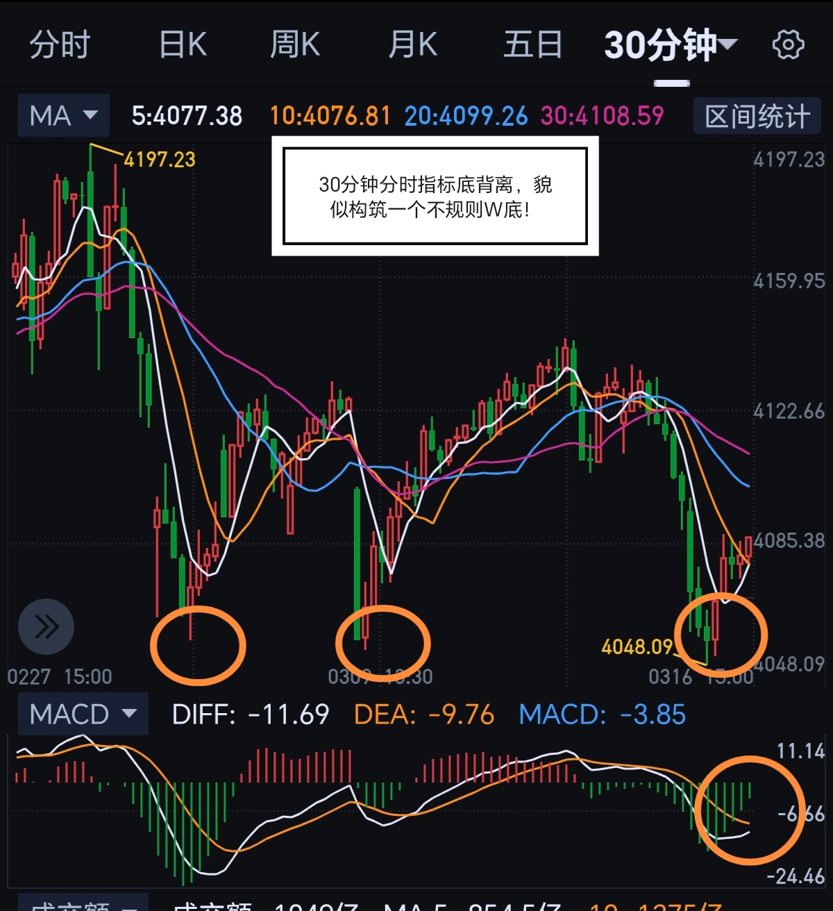 今天上证指数探底回升收带长下引线阴线,创业板、科创板指数收阳线,上证指数日线上呈现三针探底,30分钟分时指标底背离,并且构筑一个貌似不规则W底结构,接下来看反抽力度能不能突破颈线位4141点?如果突破预示调整结束,否则还是要展开箱体震荡,只不过创业板指数由于宁德时代股价创四个月新高,所以创业板指数走出上升趋势,今天港股走势强劲走出独立行情,综合各种因素看明天展开报复性反弹概率非常大。看三大指数今日涨跌不一,截止收盘,沪指跌0.26%,收报4084.79点;深证成指涨0.19%,收报14307.58点;创业板指涨1.41%,收报3357.02点。沪深京三市成交额2.34万亿,较上一交易日缩量774亿。行业板块涨跌互现,半导体、元件、航运港口、广告营销、白酒板块涨幅居前,贵金属、钢铁、煤炭、稀土、农化制品板块跌幅居前。