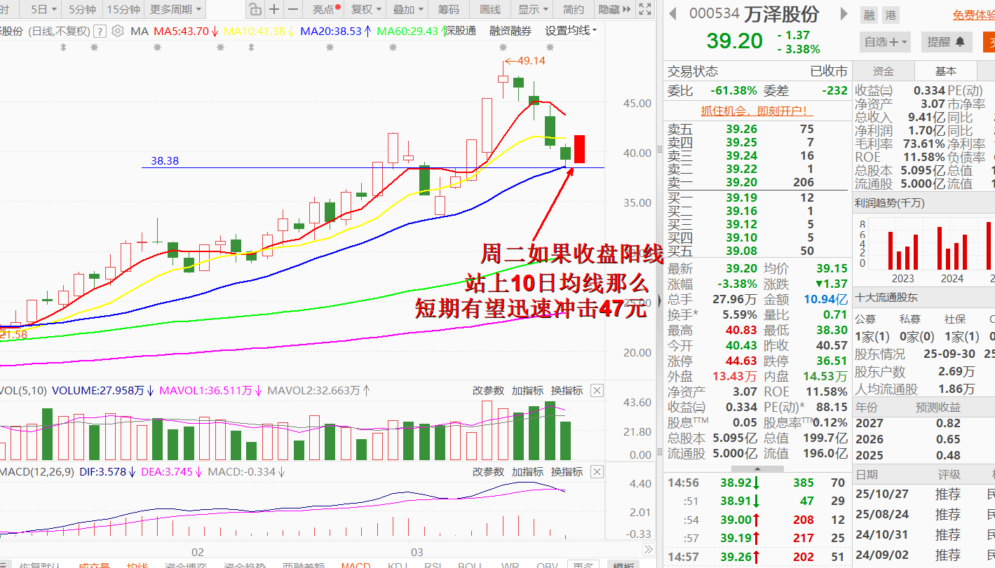 000534万泽股份,双主业黄金结构(医药现金牛 + 军工高成长),业绩与增长确定性。日线周一收中阴线,但未破关键支撑,昨日回踩 20日线支撑,未有效跌破,强支撑确认。量能缩量下跌属于主力配合大盘调整进行震荡洗盘,无需恐慌。长期价值未变。坚定持股!今日如果收盘站上10日线,短线结束洗盘调整,再次强势拉升机会加大。